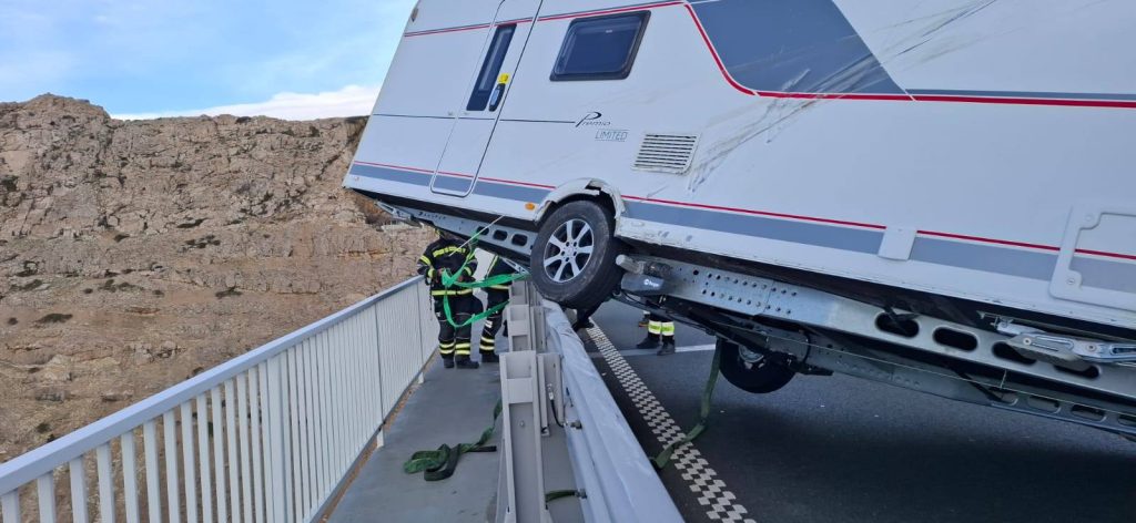 Während die Retter noch mit dem ersten Gespann kämpften, erreichte sie eine weitere Hiobsbotschaft: Nur ein Stück entfernt war durch den heftigen Wind ein weiterer Anhänger umgekippt. Auch hier leisteten die Feuerwehren aus Krk und Rijeka ganze Arbeit, stellten den Anhänger mittels Seilwinden wieder auf die Räder und geleiteten das Fahrzeug sicher von der Brücke.