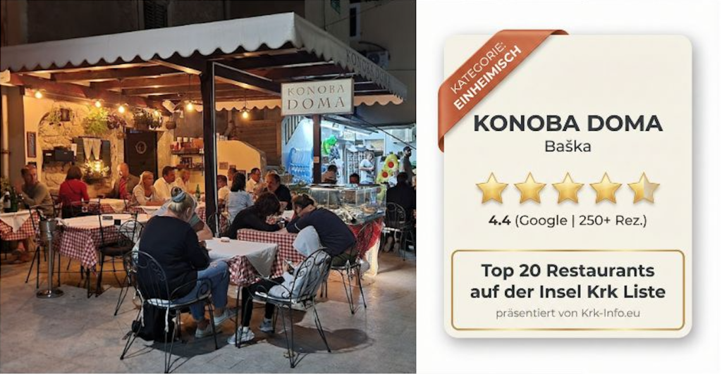 Die einheimische Küche auf Krk ist das Herzstück jeder Reise. Wer Kroatien wirklich erleben möchte, muss die traditionellen Konobas (Tavernen) besuchen. Hier dreht sich alles um authentische Krker Spezialitäten: von hausgemachten Šurlice (lokale Pasta) über zartes Lamm unter der Peka (Backglocke) bis hin zu herzhaften Fleischplatten. Unsere TOP-Auswahl basiert auf den höchsten Google-Bewertungen der Besucher, die die authentische, familiäre Atmosphäre und die Qualität der Zutaten am meisten schätzen. Entdecken Sie Restaurants wie Konoba DOMA und Konoba Nono, die die kulinarische Geschichte der Insel lebendig halten.